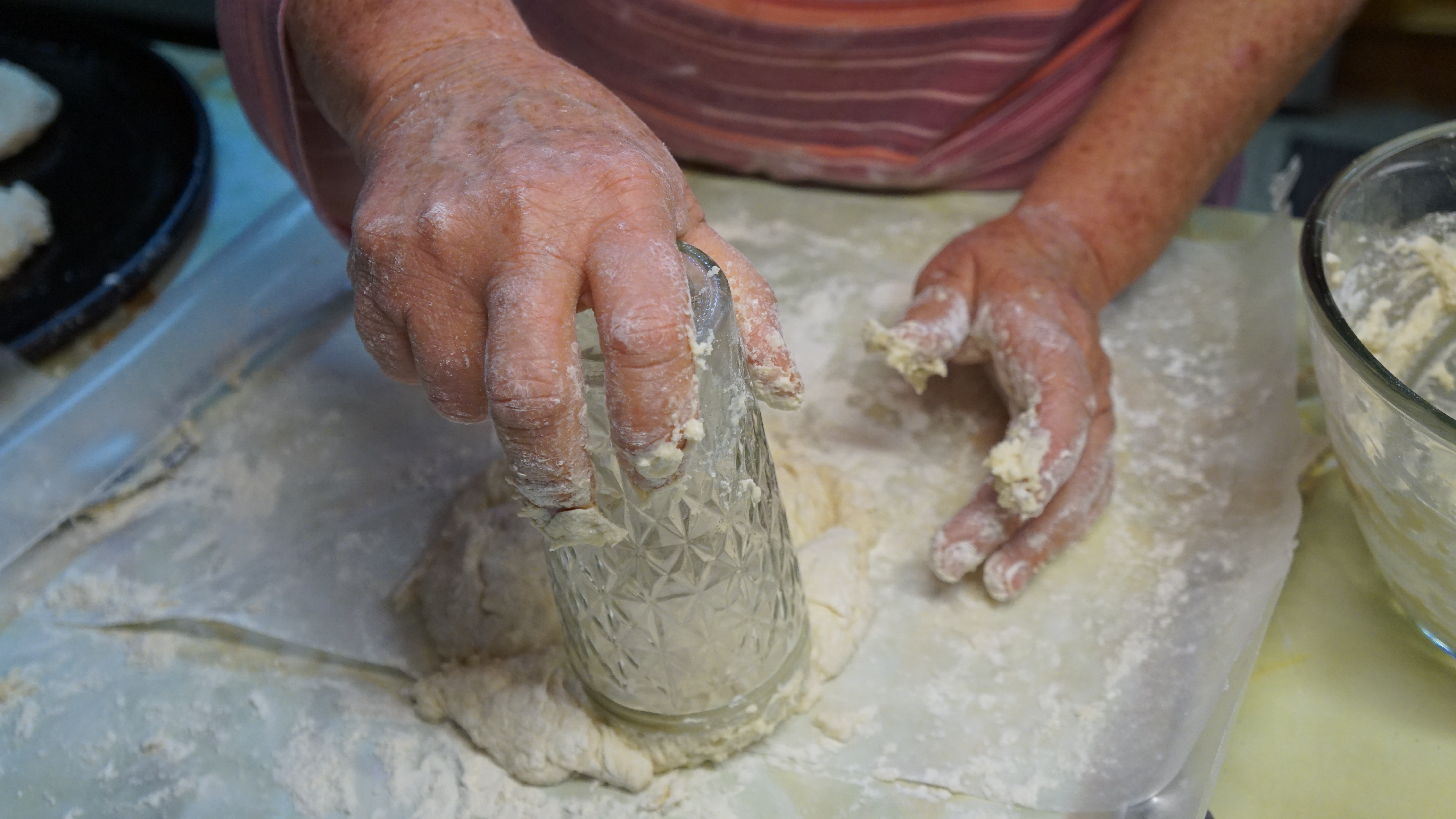 The dough can be placed on floured wax paper or a floured countertop. I smash the dough out with the palm of my hand, about a 1/2 inch thick, then fold it over on itself so a seam is created. That lets you open the biscuit easily after it’s baked instead of cutting it open.